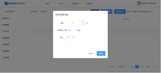 充值,应用财务管理余额分配,输入充值金额,选择充值类型对该应用进行充值;