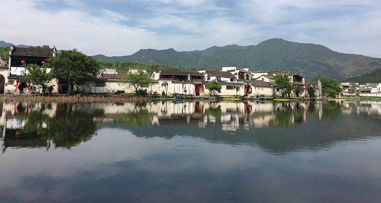 午饭过后在导游的带领下我们来到西递宏村,白墙黑瓦,鳞次栉比,马头墙翘角飞檐,高低错落。水中间有一座小小的拱桥,仿佛一道彩虹,横亘在水面上。从巷中穿过,祠堂宅院不断出现在眼内,月沼湖湖面平静,水中鱼儿悠闲的摆动着尾巴。行到水穷处,坐看云起时,随意的走走停停看看,一下午的时间就这样不知不觉消磨殆尽,太阳开始慢慢下山,日落的余辉更是给山庄别加一份魅力。
