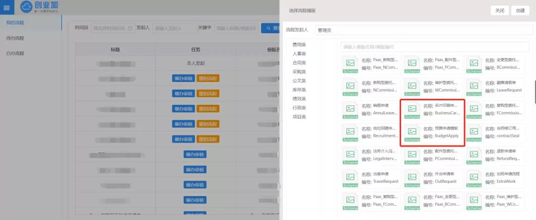 随着公司业务规模及人员数量的扩张,名片印刷、预算额度的申请量也越来越多。为减轻相关部门统筹协调的时间与精力,保证流程操作的可视化、透明化, 更新后的创业加BPM已新增【名片申请】及【预算申请】流程。使用者可直接在任务流程中完成操作,也可随时查看进度节点。