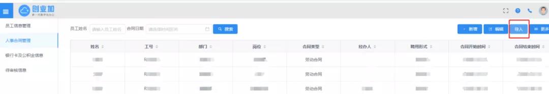 除了通过【新增】入口来上传员工合同信息之外,新版本的创业加BPM增设了【导入】按钮,使用者可在 【更多操作】中先行下载系统模板,填入信息后即可批量导入至系统中。